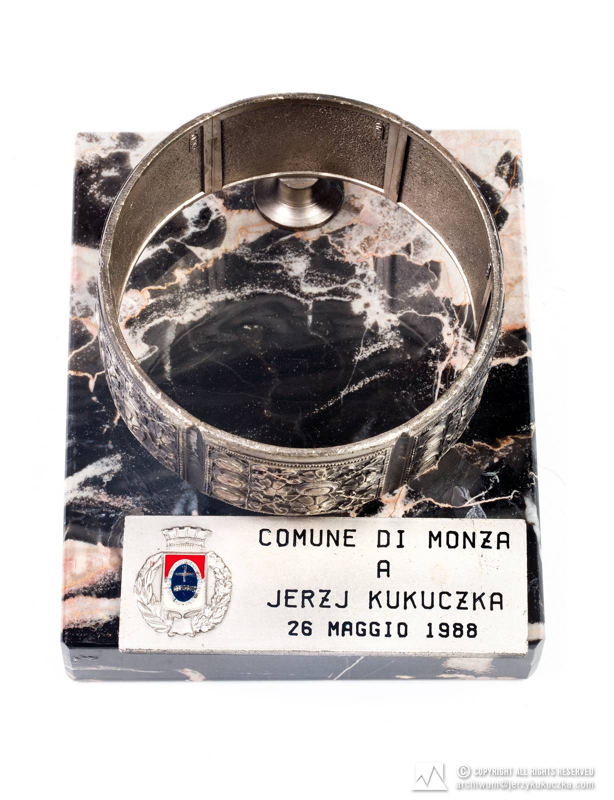 Przedmiot upamiętniający z Włoch "Comune Di Monza A Jerzy Kukuczka" 26 Maj 1988. Monza- miasto we Włoszech.