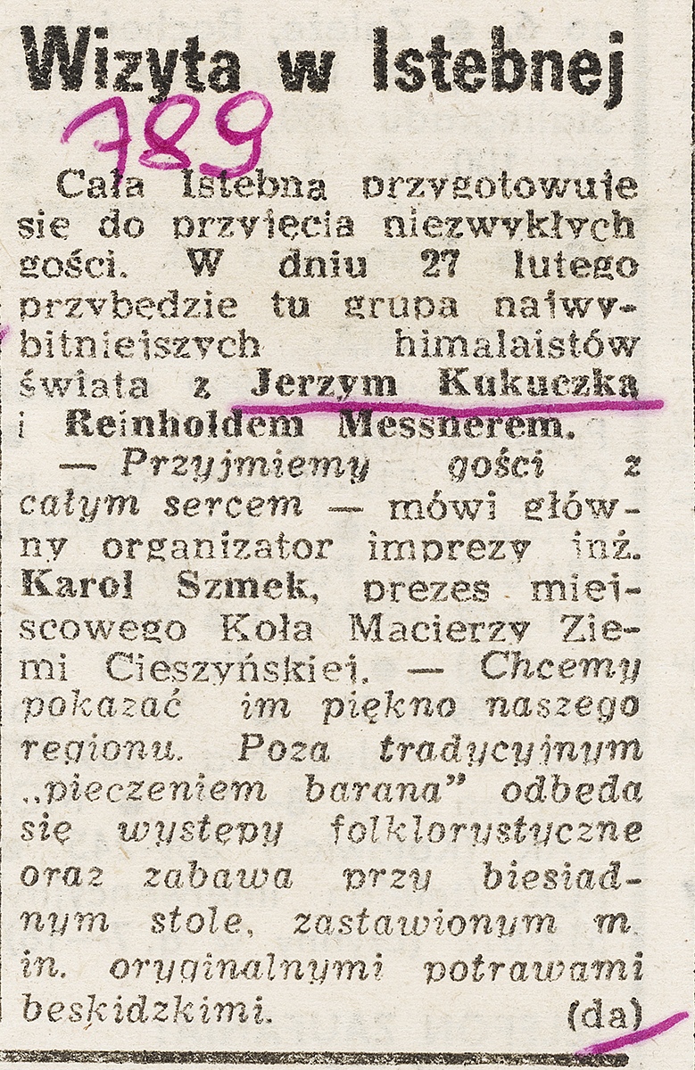 “Tańce zorganizowaliśmy w remizie strażackiej w Istebnej. Nikt się nie upił, nikt nie pobił, było wspaniale. Do dziś pamiętam, jak chłopcy z Alaski wywijali kazaczoka. Jurek zdjął granatowy aksamitny garnitur i założył góralski strój - lnianą koszulę z grubego płótna z haftem krzyżykowym na piersi, charakterystycznym dla tutejszego regionu, nogawice z białego sukna i bruclik, czyli kamizelkę. (...) Przez całe małżeństwo nasz dom był pełen ludzi. Drzwi się nie zamykały, na nadążałam z robieniem herbaty i serwowaniem jedzenia”. Cyt. za: Cecylia Kukuczka, Listy z pionowego świata. Wspomnienia żony himalaisty.