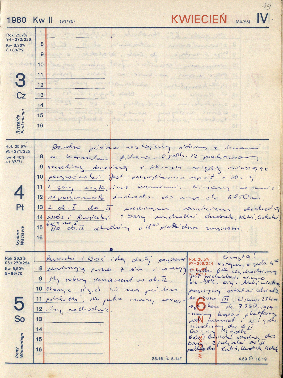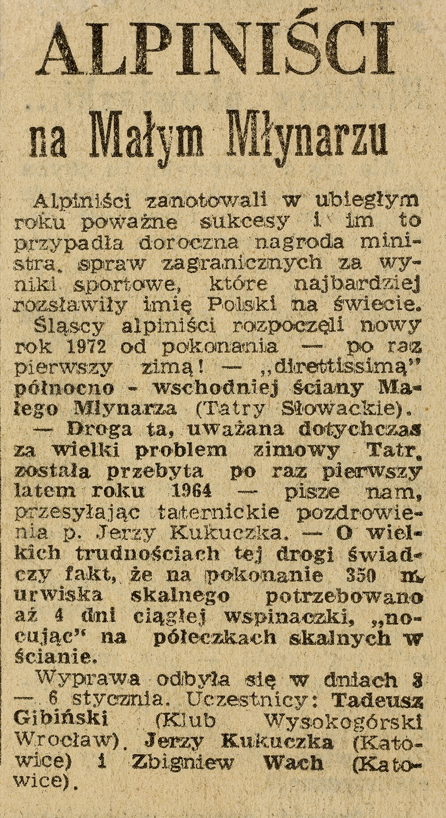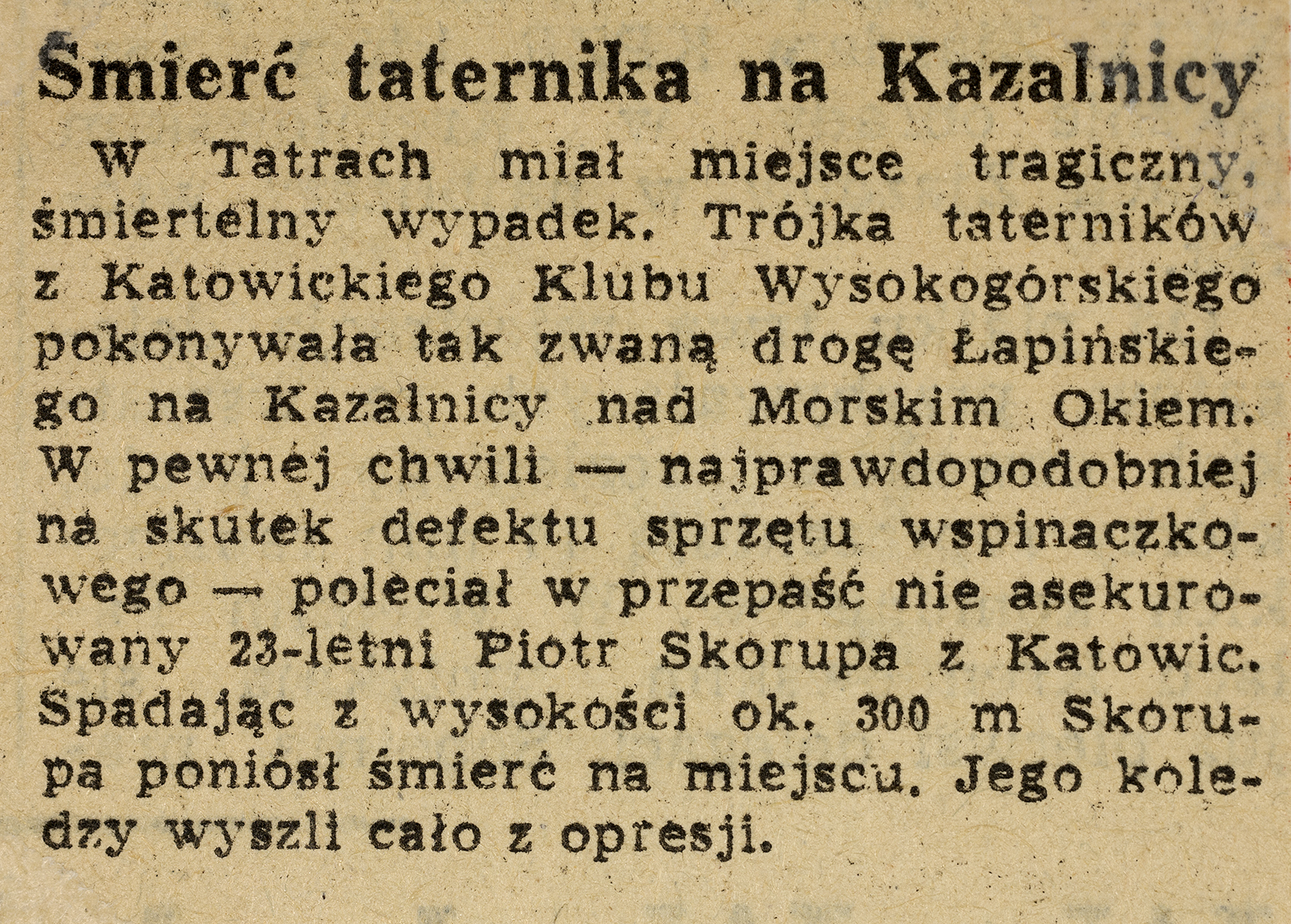 When we are finally civilians again, we decide to do Kazalnica direttissima in winter. (...) In the middle of the second day of climbing, the icy rope causes Piotr Skorupa, who goes with me, to fall and die. For the first time in the mountains I come across a tragedy, the death of a Friend. Shock. I ask myself: is it worth it or does it make any sense? Dramatic dilemma, because the mountains are pulling, but common sense says: give it a rest ...